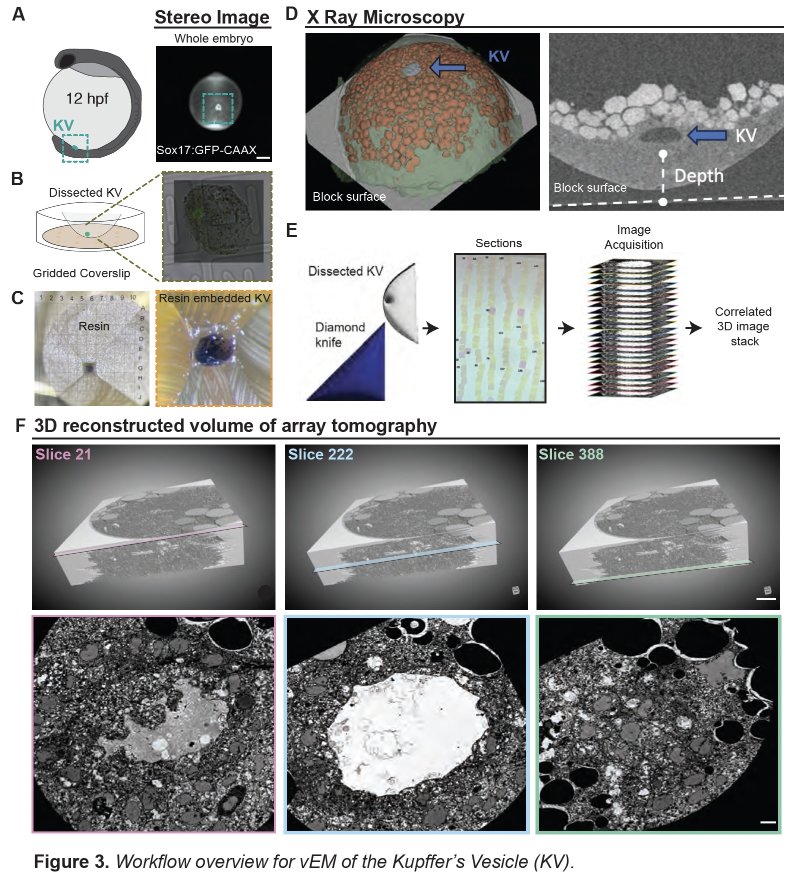 Volume electron microscopy (vEM): We generated the first high-resolution 3D ultrastructural map of a mature KV, enabling unprecedented analysis of ciliary architecture across the tissue.
